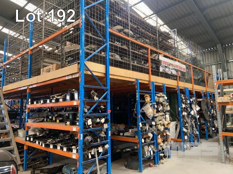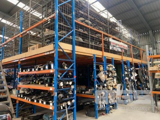 DEXION MEZZANINE FLOOR STRUCTURE 12 X 12m AREA APPROX 8 x 4 BAYS DEXION PALLET RACKING 2.5m MEZZANINE HEIGHT 6m UPRIGHTS OUTER & CENTRE MEZZANINE RACKING STRUCTAFLOOR BASE WITH 90 x 40mm BEAMS HANDRAIL EDGE & FORKLIFT DOCK AREA & STEEL ACCESS STEPS