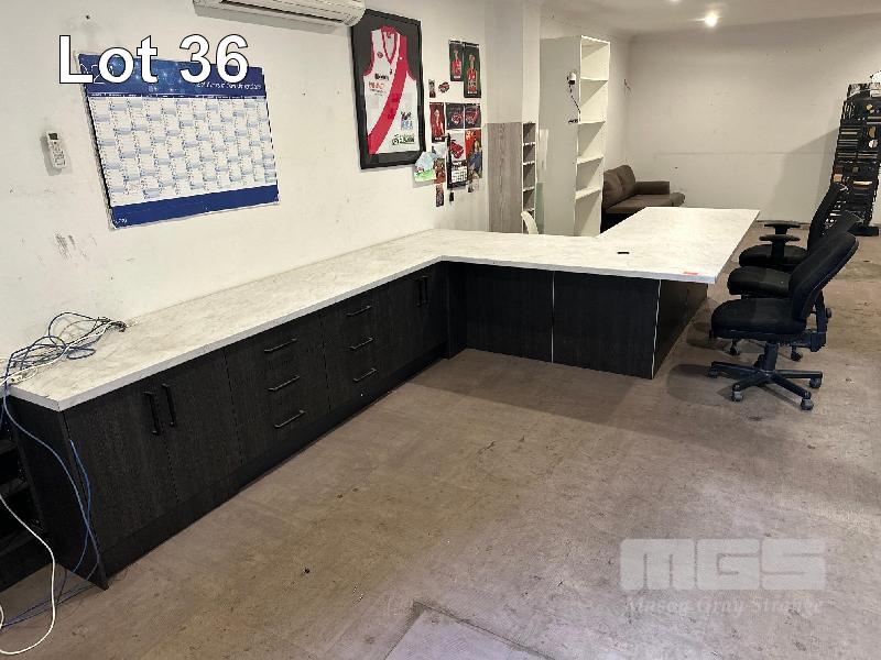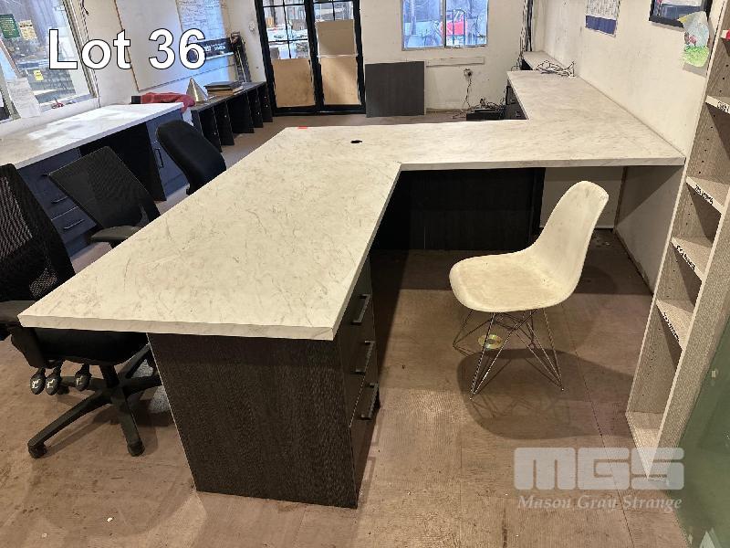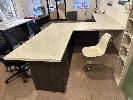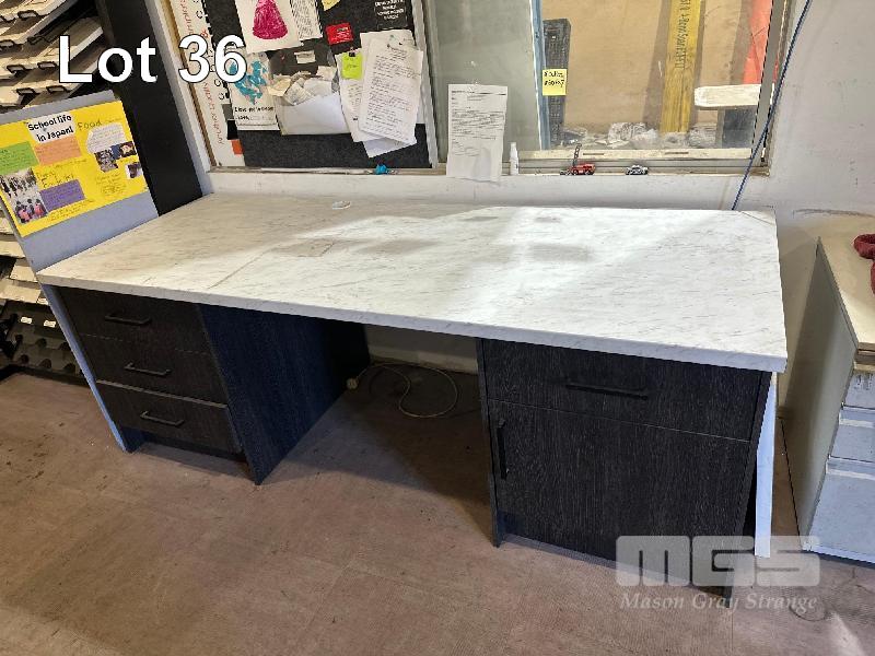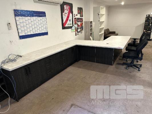DESK WORK STATION & STORAGE, 2 x L-SHAPED CABINETS & DESK, MARBLE LOOK LAMINATE TOP, 4 x 2 x 2m & CHAIRS