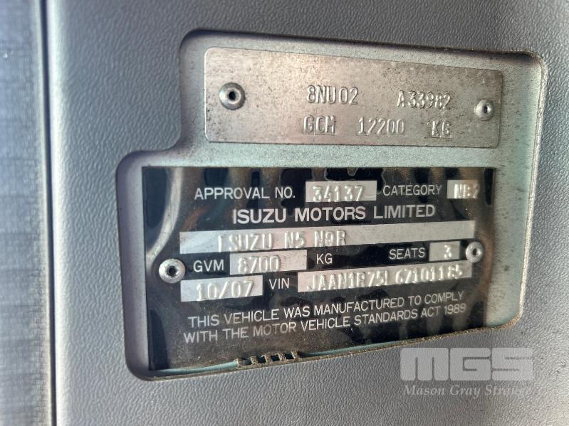 2007 ISUZU NQR N5 4x2 SINGLE CAB REFRIGERATED PANTEC REG: NO PLATES VIN: JAAN1R75L67101185 ENG: 4HK1574167 ODO: 242,165kms SHOWING GVM: 8,700kg GCM: 12,200kg ISUZU SITEC 175, 5.2 LITRE TURBO DIESEL, 6 SPEED MANUAL TRANSMISSION, SPRING SUSPENSION, WHITE DUCO, 2 DOORS, 3 SEAT, AIR CON, CD PLAYER, BULL BAR, STEEL RIMS, PEKI REFRIGERATED PANTEC BODY SIZE: 4300 x 2500 x 2450mm (H) FITTED WITH MOVABLE INTERNAL WALL, 2 x SIDE & 3 x REAR DOORS CARRIER EASYCOLD, REFRIGERATION FREEZER UNIT POWERED BY DIESEL ENGINE WITH CARRIER TRANSICOLD DIGITAL IN CAB CONTROLLER SPARE WHEEL KEY #39 (WITH 1 KEY/S)