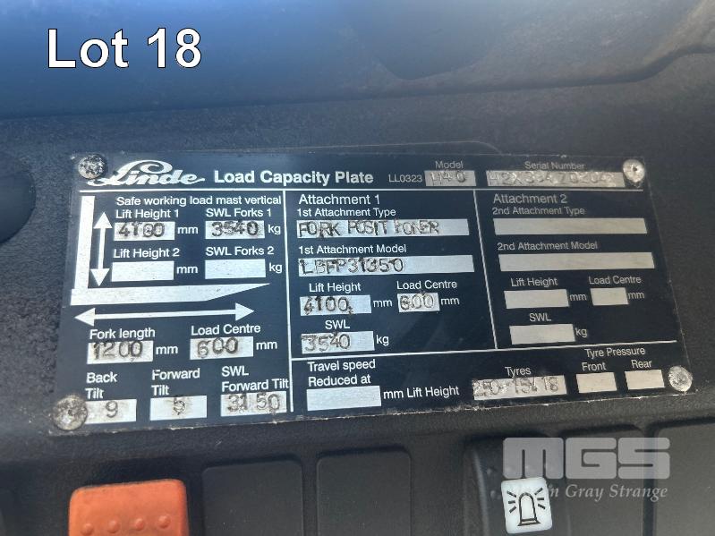 2009 FORKLIFT, LINDE MOD: H40T S/NO: H2X394Z02042 RATED CAP: 4,000kg 5 CYLINDER LPG ENGINE, 53kw HOURS: 7,144 SHOWING 2 STAGE CLEARVIEW MAST WITH TYNE POSITIONING, CARRIAGE EUROLIFT LPFP1350 RATED CAP: 3,500kg @ 500mm LIFT HEIGHT: 4,100mm FORK LENGTH: 1,200mm DIGITAL WEIGHT SCALE UNIT, ACE SLIMLINE II MOD: GRQX-2005 KEYPAD LOCK OUT (PIN CODE IN OFFICE STOCK SHEET) SOLID TYRES, TWIN LPG GAS BOTTLES
