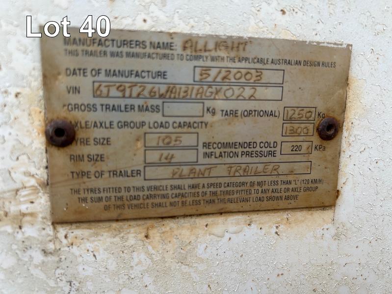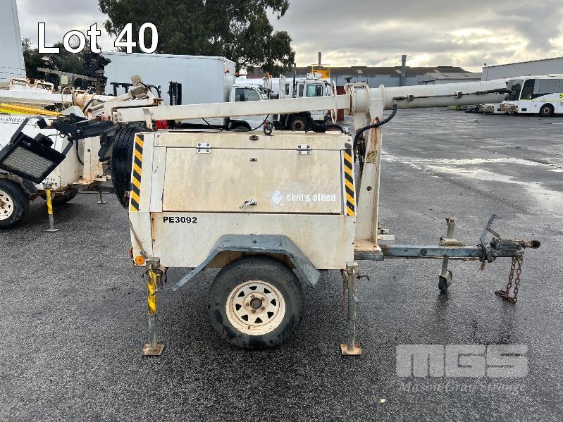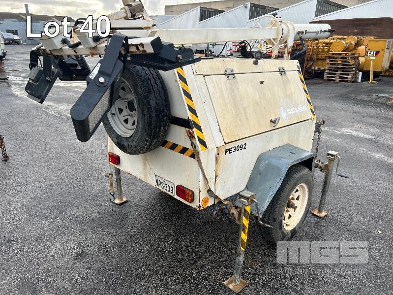 2003 TRAILER MOUNT LIGHTING TOWER, ALLIGHT REG: NPS 339 VIN: 6T9T26WA131AGX022 SINGLE AXLE POWERED BY PERKINS 3 CYLINDER DIESEL ENGINE, HOURS: 3,892 SHOWING 4 x LED LIGHTS ON TILT UP, TELESCOPIC MAST, 4 x OUTRIGGERS, BALL HITCH, JOCKEY WHEEL, SPARE WHEEL & BRAKES