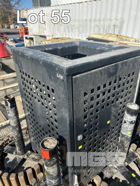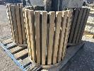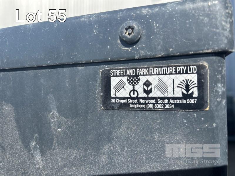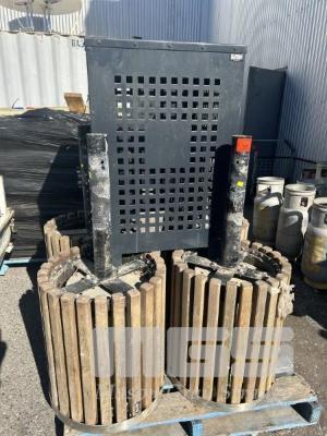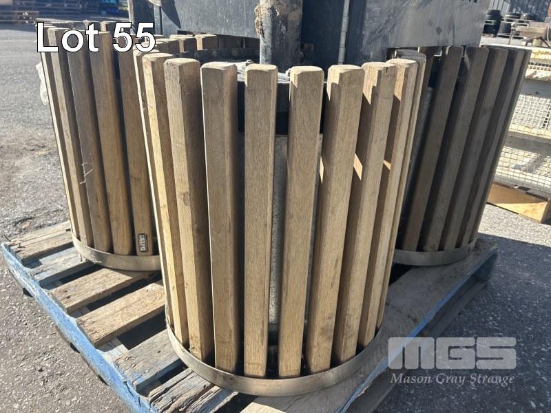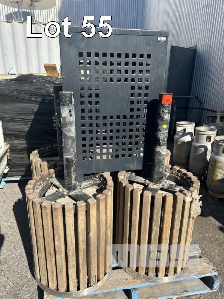 4 x DECORATIVE RUBBISH BINS, OUTDOOR/PARKS, STAINLESS STEEL WITH TIMBER SLATS, POST MOUNT, 5500 DIA x 650mm (H) & 1 x BLACK STEEL MESH RUBBISH BIN SURROUND, STREET & PARKS FURNITURE 630 x 980mm (H) 1 x PALLET