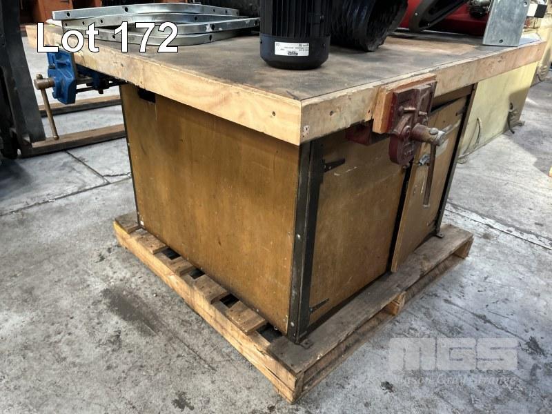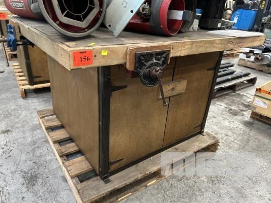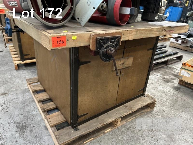 TIMBER WORK BENCH, 1250 x 1400 x 830mm (H), WITH DAWN VICE, 175mm & CLAMP VICE, 175mm, WITH UNDER BENCH STORAGE