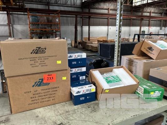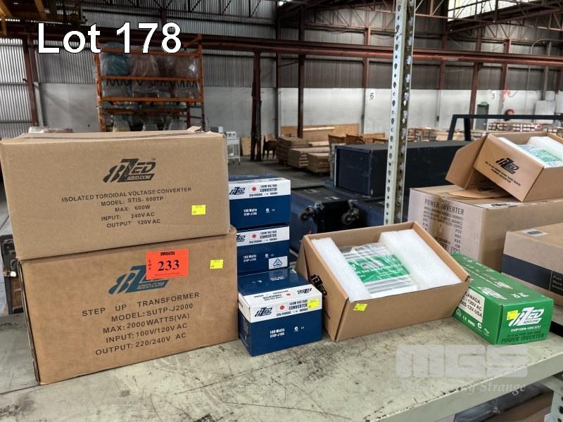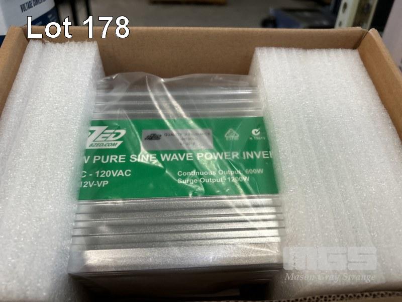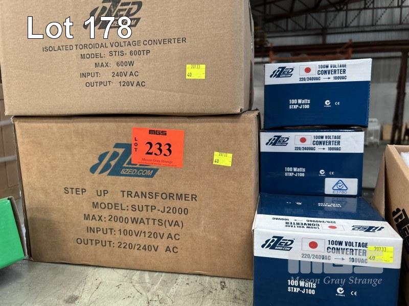 2 x POWER INVERTERS, 8 ZED, PURE SINE WAVE 600w- 12V DC TO 120VAC, 150w - 12V DC TO 120VAC, STEP DOWN CONVERTERS 600w - 240V, TO 120VAC, 4 x 100w, 240V TO 120VAC, STEP UP 2000w - 120V TO 240VAC AS NEW