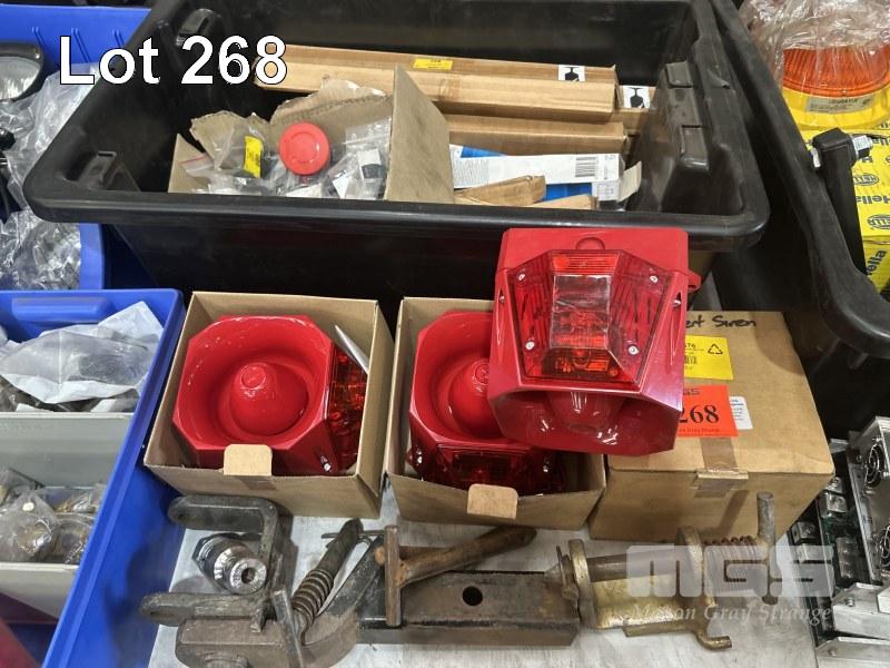 2 x SPOT LIGHTS, SPEAKER, 24V, 4 x HAZARD LIGHTS WITH SIRENS, BATTERY CLAMPS, ELEC FITTINGS, FLURO TUBES, SIGHT LEVEL GAUGES, HAZARD BEACON LIGHTS, ETC, AS NEW