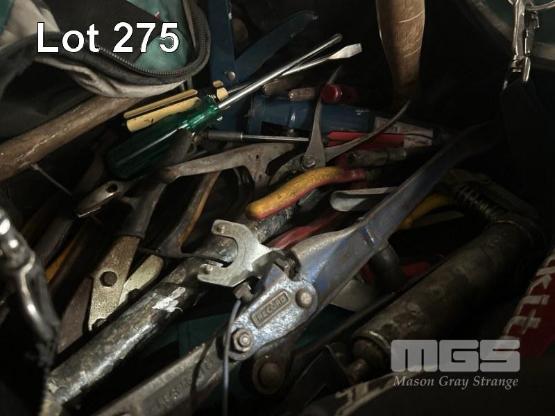 MAKITA TOOL BAG WITH ASSORTED HAND TOOLS, INC. SET SQUARES, SHIFTERS, CUTTERS HAMMERS, BOLT CUTTERS, GREASE GUNS, ETC WITH 7 x HEAVEY DUTY RATCHET STRAPS