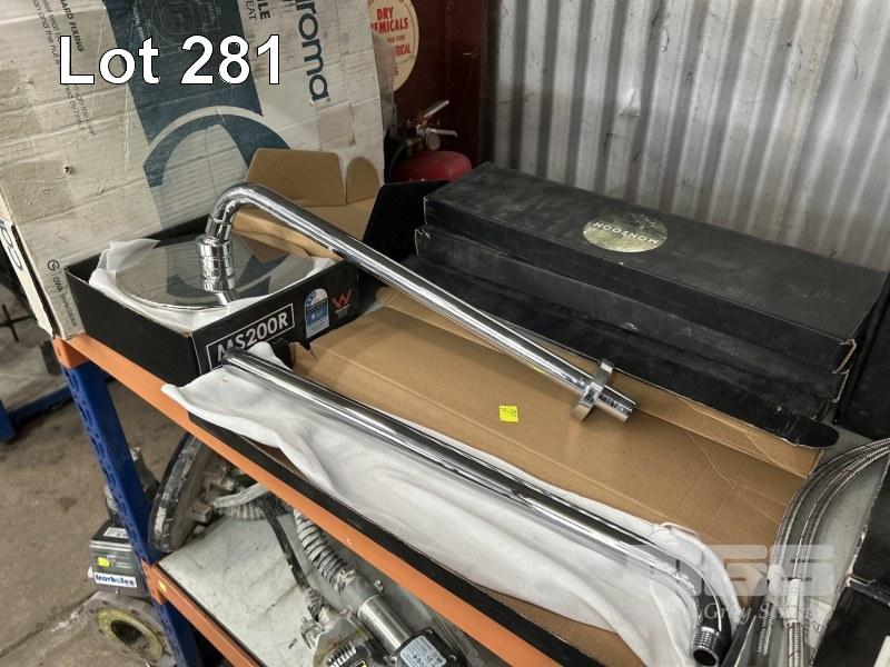 ASSORTED BATHROOM WARE INCLUDING SHOWER HEAD, TAPS, TOWEL RAILS,