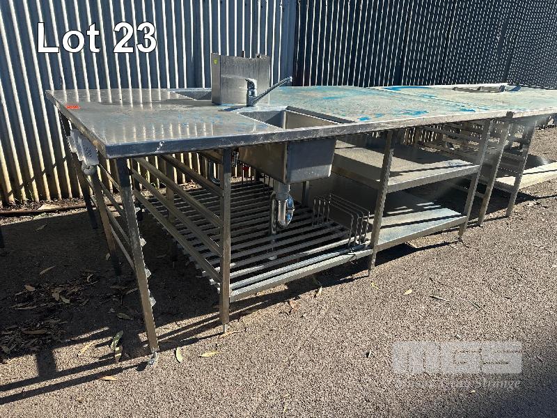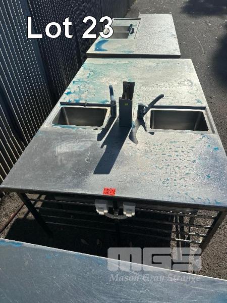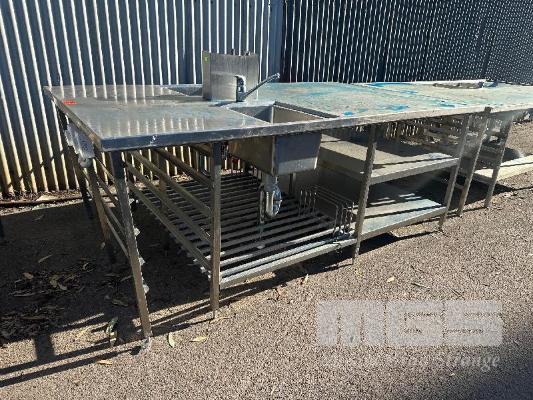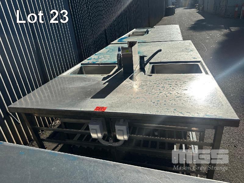 LARGE STAINLESS STEEL CENTRE ISLAND BENCH WITH 2 x DEEP BOWL SINKS, UNDER BENCH STORAGE