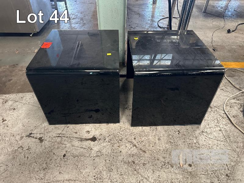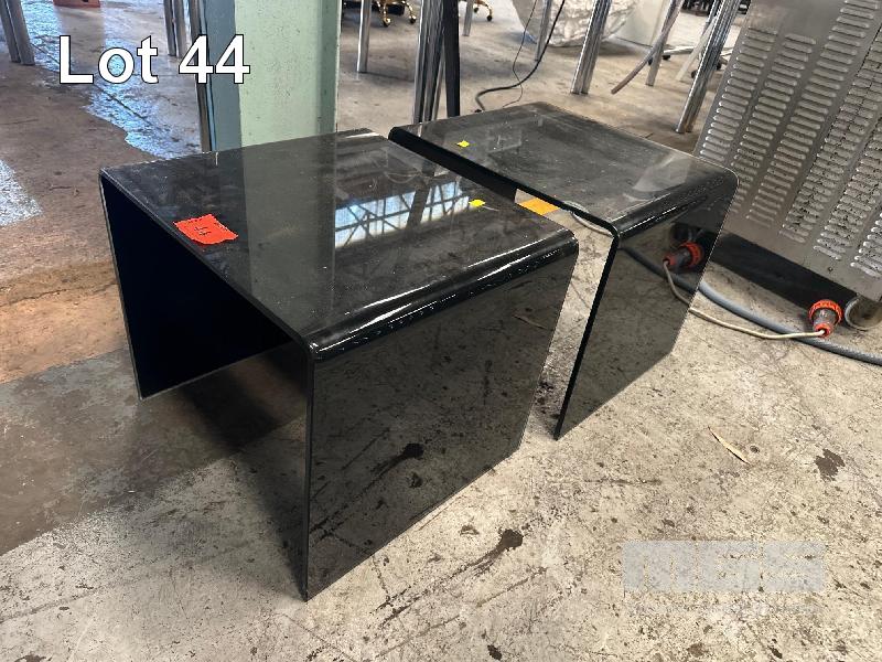 2 x CURVED GLASS SIDE TABLES, 480 x 530mm, (1 x CHIPPED)