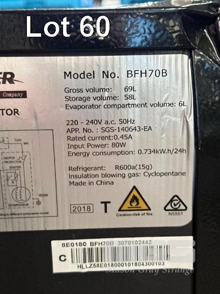 BAR FRIDGE, HELLER MOD: BFH70B CAPCITY: 58L 240V 10 AMP