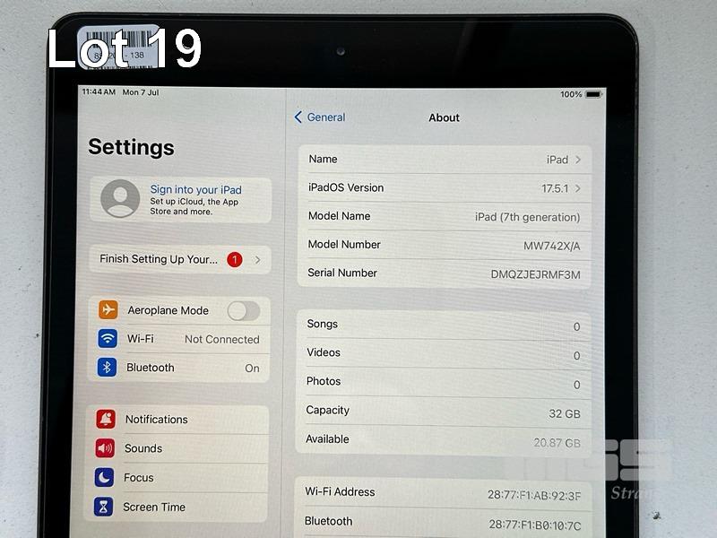 APPLE iPAD 7TH GEN, 32GB, Wi-Fi, SPACE GREY, MODEL MW742X/A, A2197 WITH CABLE & CHARGER (NOTE: MINOR SCRATCHES ON SCREEN) S/N:DMQZJEJRMF3M