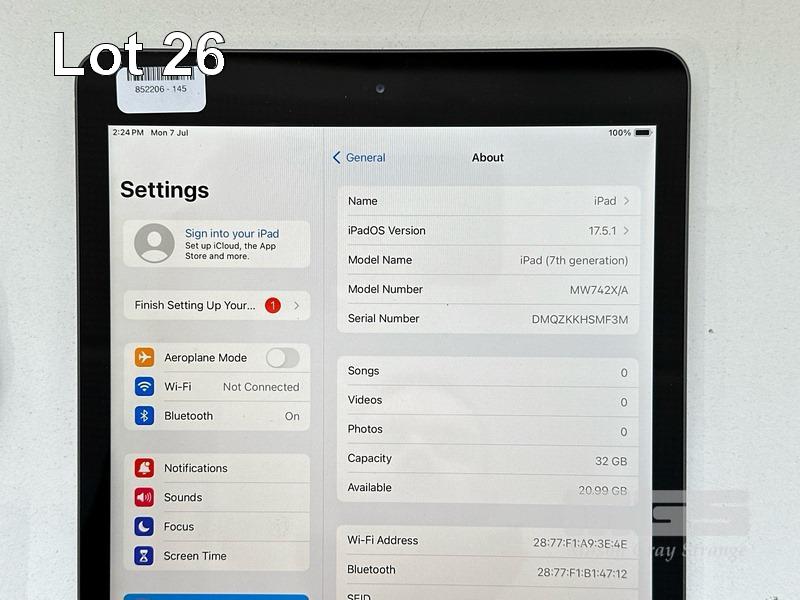 APPLE iPAD 7TH GEN, 32GB, Wi-Fi, SPACE GREY, MODEL MW742X/A, A2197 WITH CABLE & CHARGER (NOTE: MINOR SCRATCHES ON SCREEN) S/N:DMQZKKHSMF3M