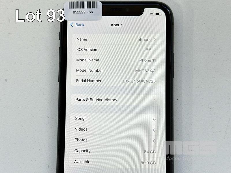 APPLE iPHONE 11, 64GB, MODEL MHDA3X/A, A2221, BLACK, BATTERY HEALTH 78% (NO CABLE, NO CHARGER) (NOTE: BATTERY SERVICE MESSAGE) S/N:DX4GN6QWN735