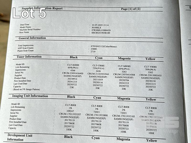 PHOTOCOPIER, SAMSUNG MULTIXPRESS X4300LX COLOUR DIGITAL, ADF, PRINTER USB & NETWORK PORTS, 66,954 COLOUR & 42,047 B&W PAGES (TEST PAGE ATTACHED) (NOTE: IMAGING UNITS LOW) S/N:07RXBJLJ100042D