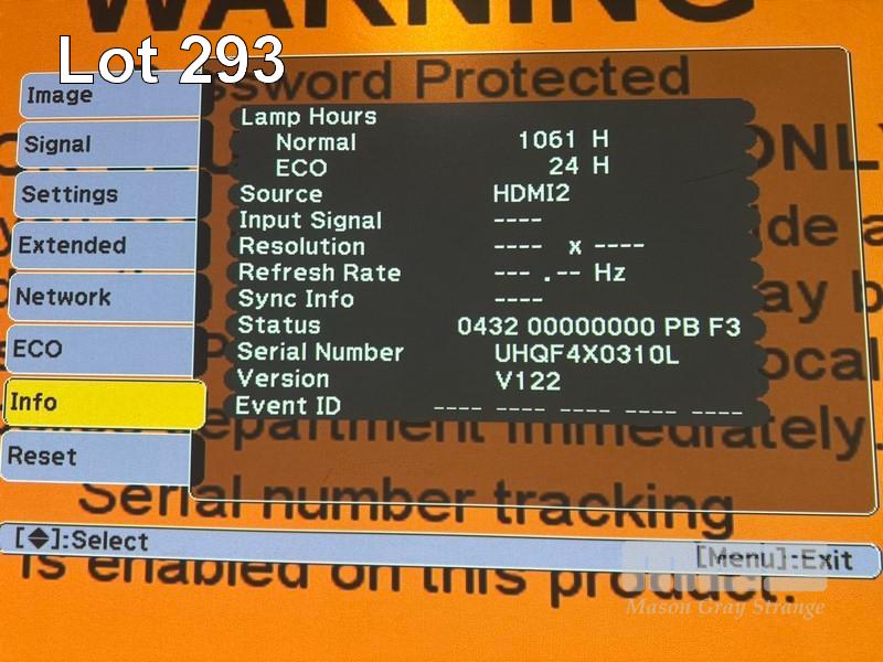 PROJECTOR, EPSON EB-595Wie ULTRA SHORT THROW, 3300 LUMENS, 1,061 NORMAL HOURS & 24 ECO HOURS SHOWING & REMOTE WITH BRACKET S/N:UHQF4X0310L
