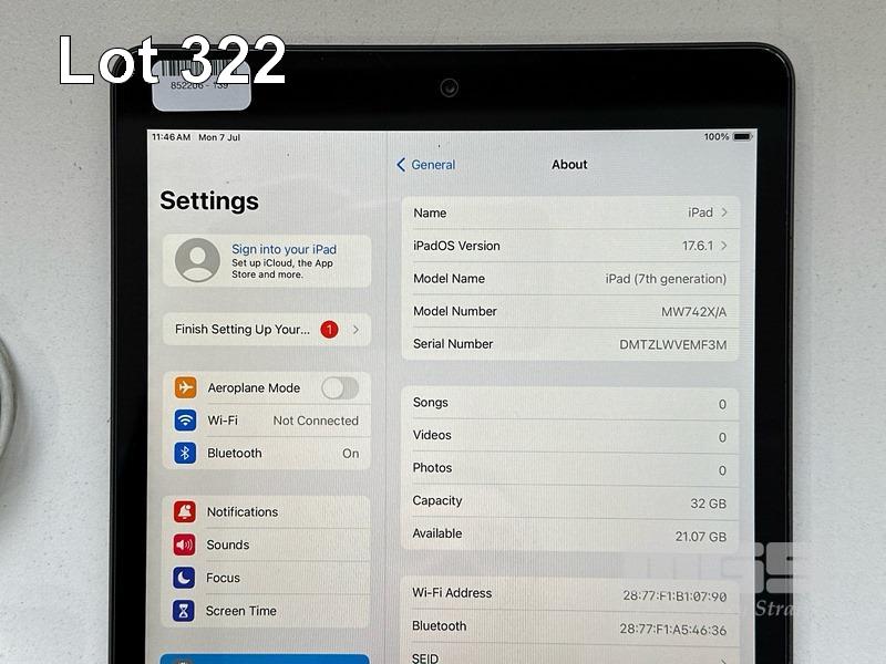 APPLE iPAD 7TH GEN, 32GB, Wi-Fi, SPACE GREY, MODEL MW742X/A, A2197 WITH CABLE & CHARGER (NOTE: MINOR SCRATCHES ON SCREEN) S/N:DMTZLWVEMF3M