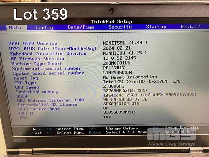 LAPTOP, LENOVO THINKPAD P53 MOBILE WORKSTATION, TYPE 20QQ, XEON E-2276M @ 2.8GHz, 32GB DDR4 RAM, 512GB NVMe M.2 SSD, 15.6" WIDESCREEN (1920x1080), 16GB NVIDIA QUADRO RTX 5000 VIDEO, Wi-Fi, BLUETOOTH, WINDOWS 11 PRO INSTALLED & POWER SUPPLY S/N:PF147B17