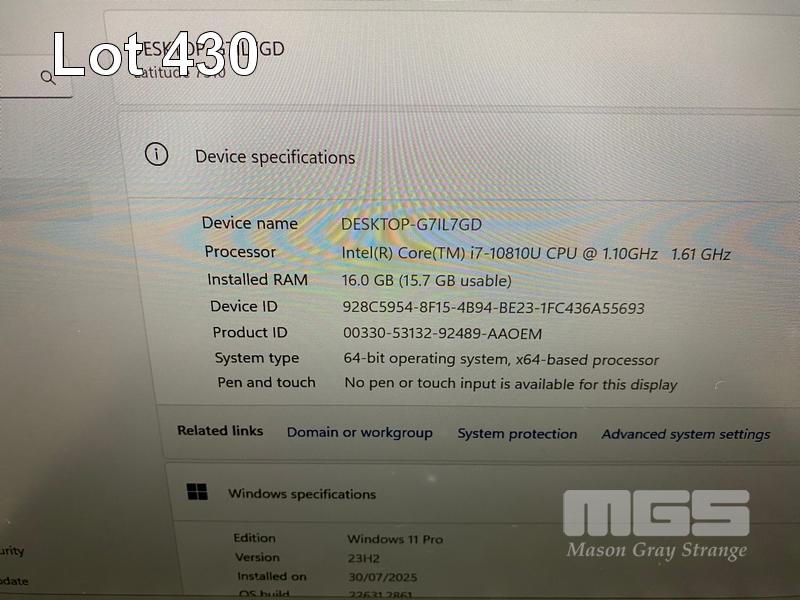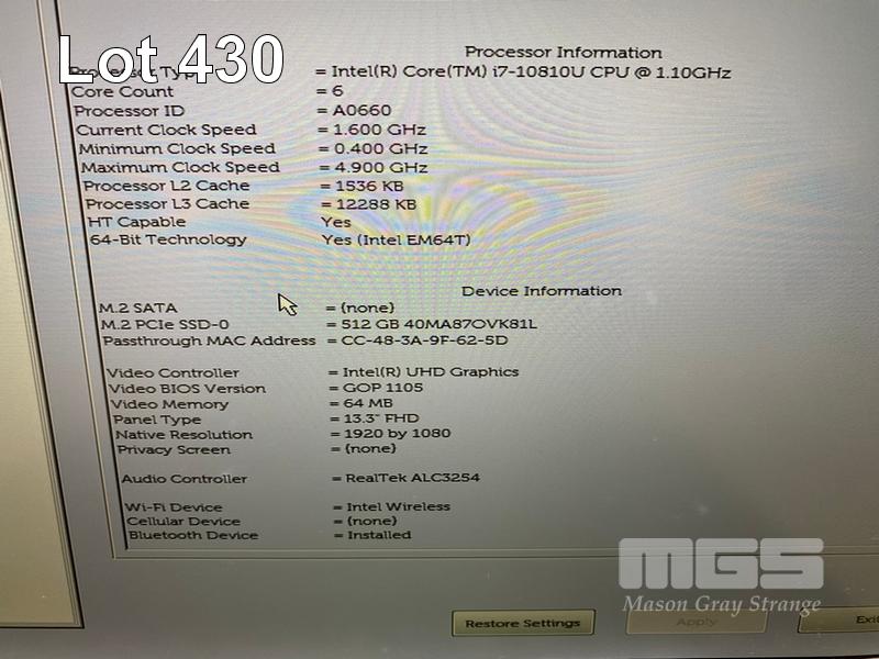 LAPTOP, DELL LATITUDE 7310, CORE i7 10810U (10TH GEN) @ 1.1GHz, 16GB DDR4 RAM, 512GB NVMe M.2 SSD, 13.3" WIDESCREEN (1920x1080), INTEL UHD GRAPHICS, Wi-Fi, BLUETOOTH, WINDOWS 11 PRO INSTALLED (NO USB-C POWER SUPPLY) (NOTE: SPOTS ON SCREEN, RUBBER PAD MISSING ON BOTTOM OF LAPTOP) S/N:88TXK63