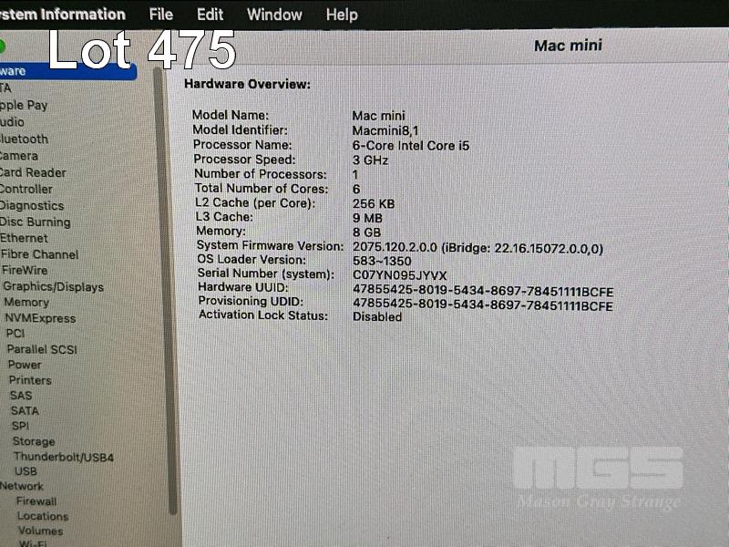 APPLE MAC MINI (A1993), CORE i5 8500B (8TH GEN) @ 3GHz, 8GB DDR4 RAM, 256GB SSD, INTEL UHD GRAPHICS 630, Wi-Fi, BLUETOOTH, MAC OS 15 INSTALLED, KEYBOARD (A1843) & MOUSE (A1657) (NO CABLE) S/N:C07YN095JYVX