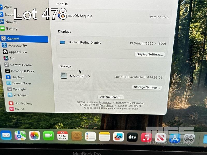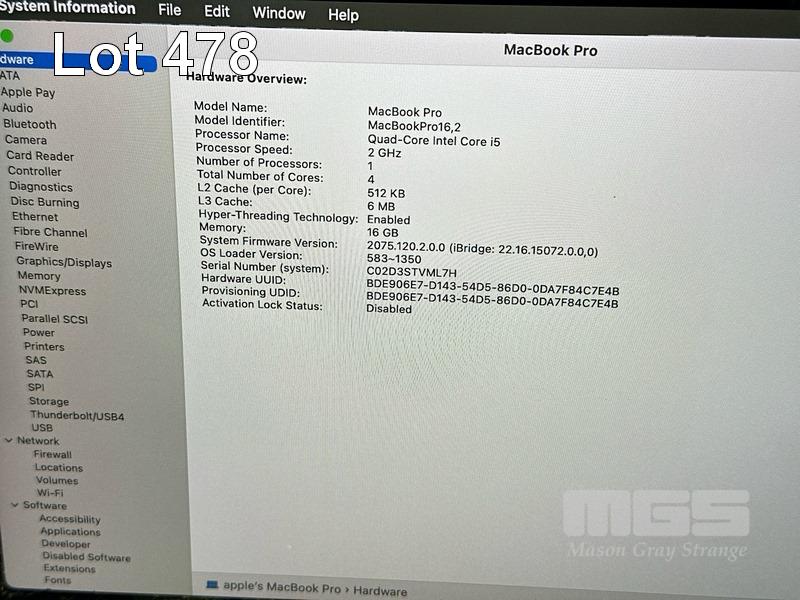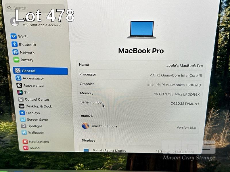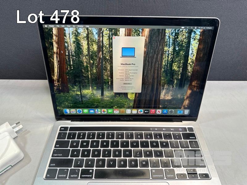 LAPTOP, APPLE MACBOOK PRO (A2251), CORE i5 1038NG7 (10TH GEN) @ 2GHz, 16GB DDR4 RAM, 512GB SSD, 13.3" RETINA DISPLAY (2560x1600), INTEL IRIS PLUS GRAPHICS, Wi-Fi, BLUETOOTH, MAC OS 15 INSTALLED & USB-C POWER SUPPLY (NOTE: DAMAGE TO SCREEN FRAME, MINOR DENTS IN CASING, MINOR MARKS ON SCREEN) S/N:C02D3STVML7H