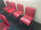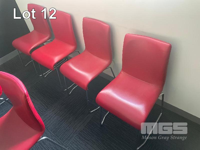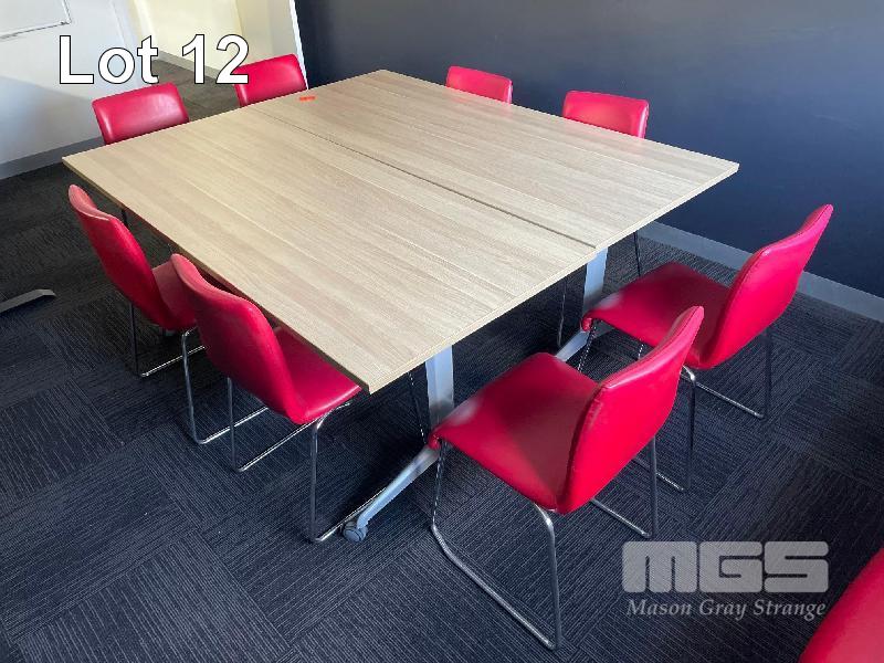 2 x MEETING TABLES, TILTING TOPS, MOBILE TILTING SPACE SAVERS, PINE LAMINATE TOP, STEEL FRAME, + 12 x RED VINYL CHROME FRAME CHAIRS