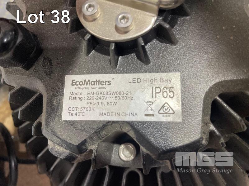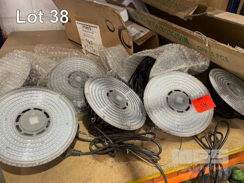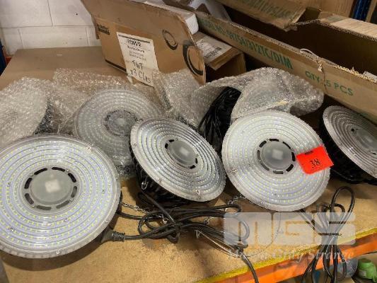 8 x ROUND LED HIGH BAY LIGHTS, 5700k, 240V PLUGS, 3 x LED FLUSH MOUNT CEILING LIGHTS, 6500k