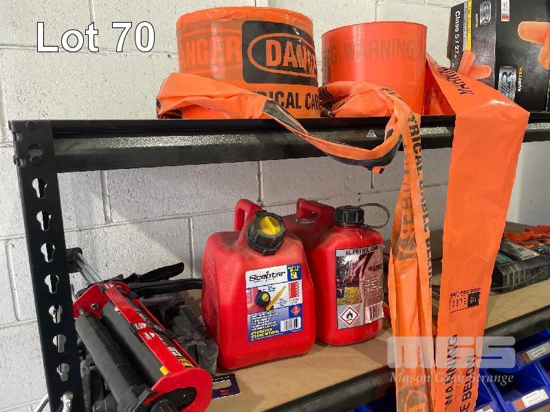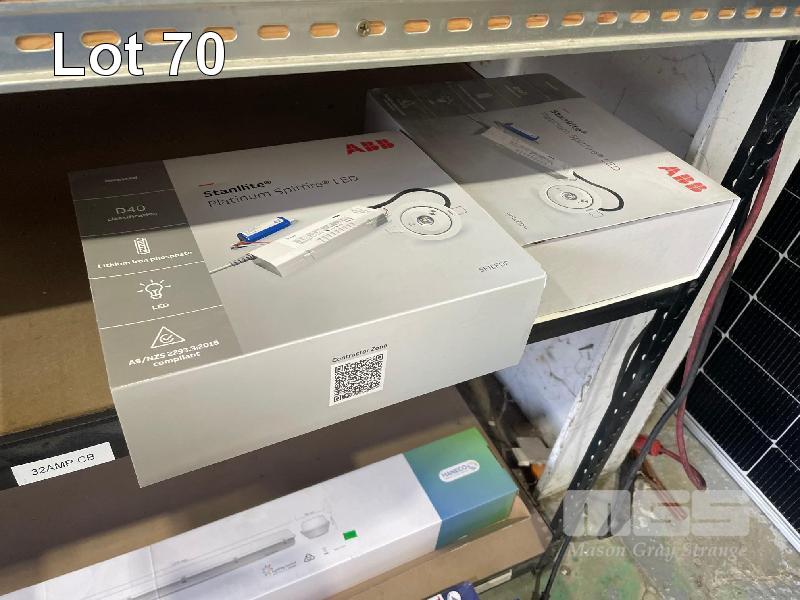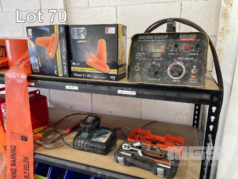 CONTENTS OF RACK, LED FLUROS, ABB SPITFIRE LIGHTS, PLASTIC TUBS, TOOLS, BATTERY CHARGER