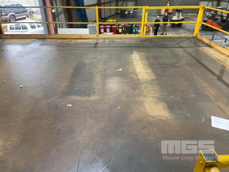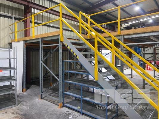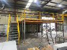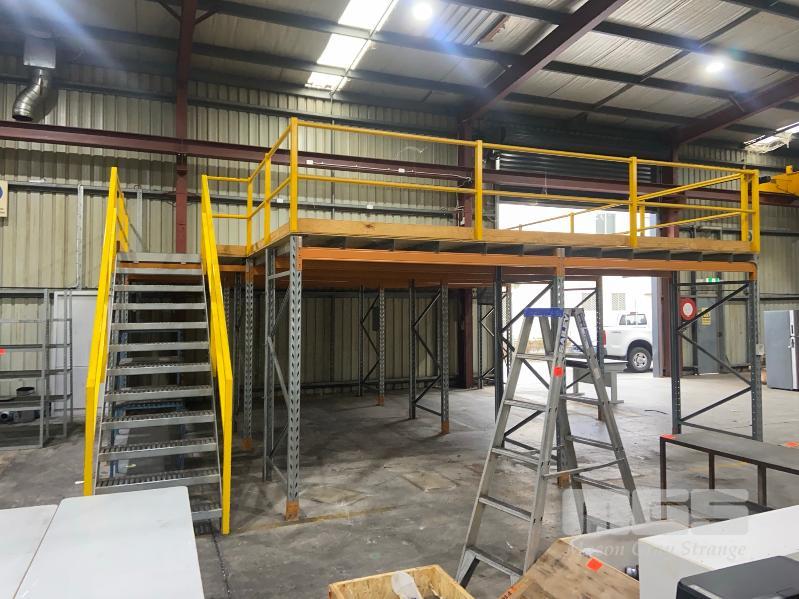 MEZZANINE FLOOR 6.9 mtrs L X 6.4 mtrs D X 2,4 mtrs h . COLBY UPRIGHTS AND CROSS BEAMS , WITH STAIRCASE, SAFTEY RAILS , FORKLIFT ACCESS GATE, PARTICAL BOARD FLOOR . FLURO LIGHTS UNDER NEATH.