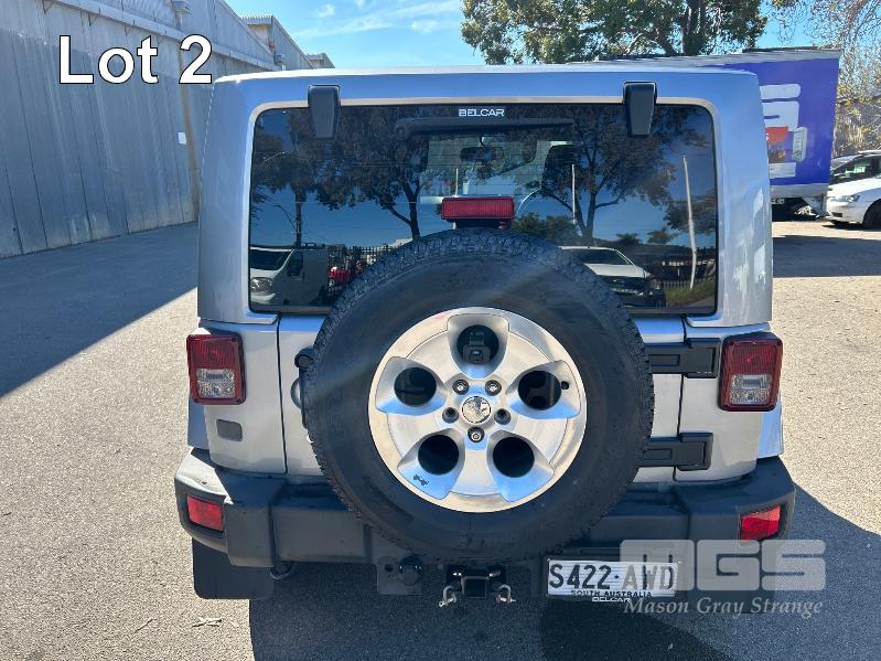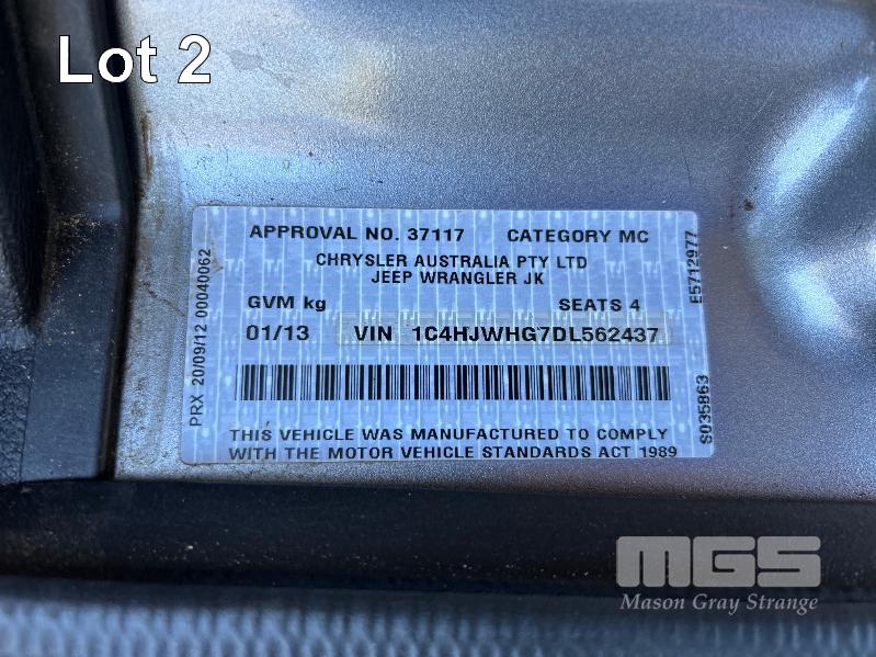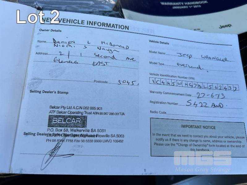 2012 JEEP WRANGLER OVERLAND JK SUV 4x4 REG: S422 AWD (SA) VIN: 1C4HJWHG7DL562437 ENG: DL562437 ODO: 119,085kms SHOWING 3.6 LITRE VVT PETROL, AUTOMATIC TRANSMISSION, SILVER DUCO, 2 DOORS, 4 SEAT, 4x4 ABS, AIR BAG, AIR CON, ALLOY WHEELS, BLUETOOTH, CENTRAL LOCKING, CRUISE CONTROL, IMMOBILISER, LEATHER TRIM, POWER STEERING, POWER WINDOWS, SIDE STEP, SPARE WHEEL, FULL ROLL CAGE WITH SOFT TOP & HARD TOP ROOFS REVERSE CAMERA & LCD KEY #20 (WITH PAPERS, WITH 2 KEY/S, WITH OWNER'S MANUAL, WITH SERVICE BOOKS)