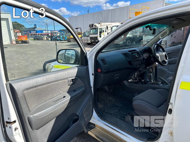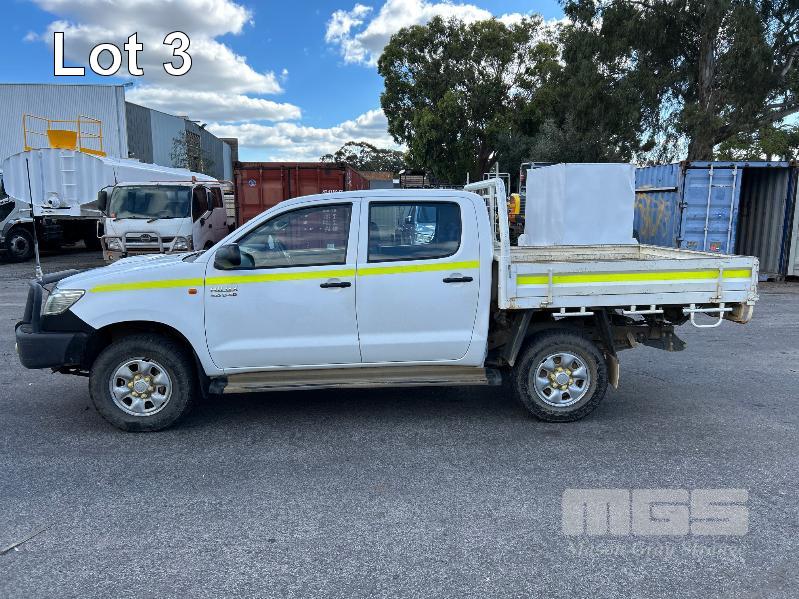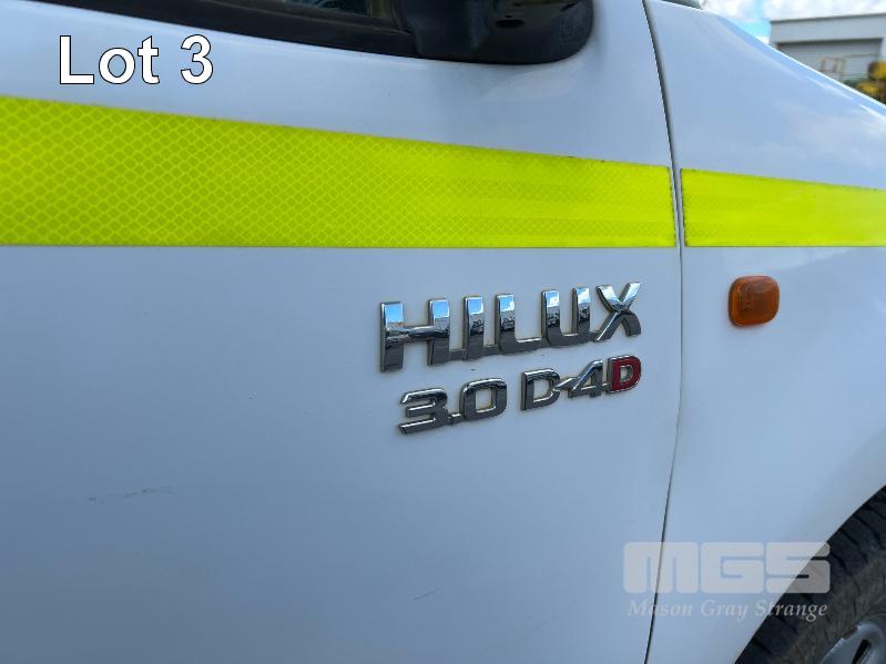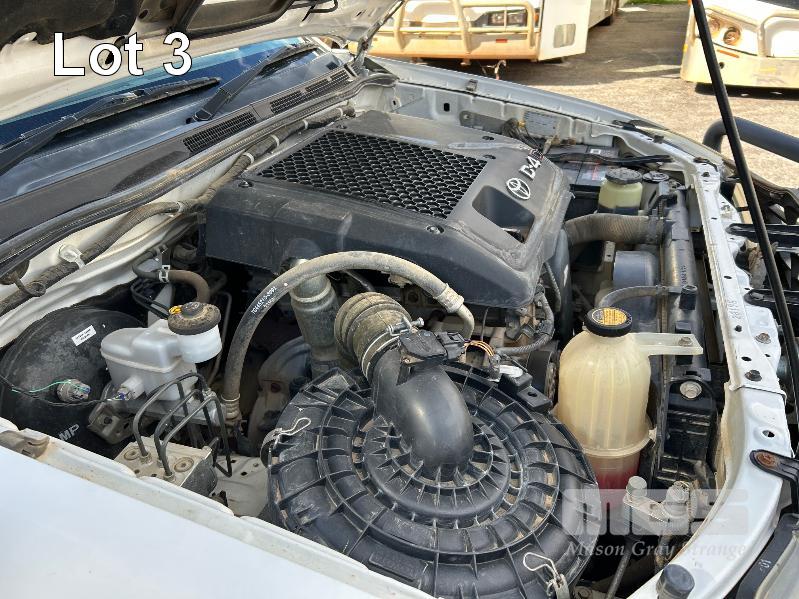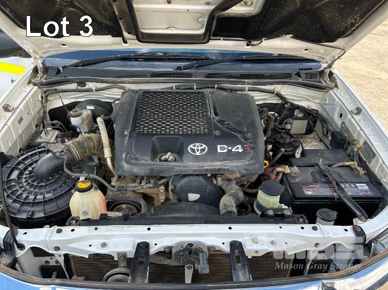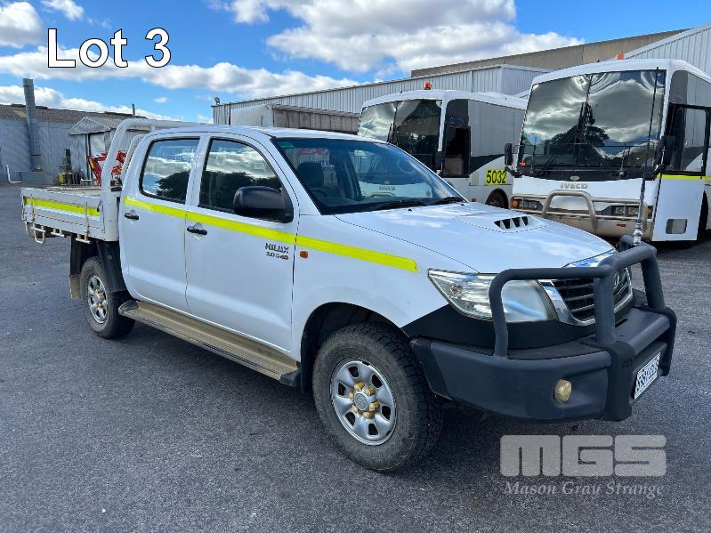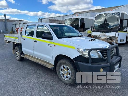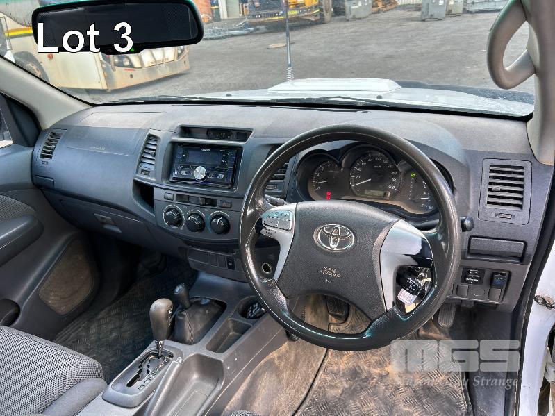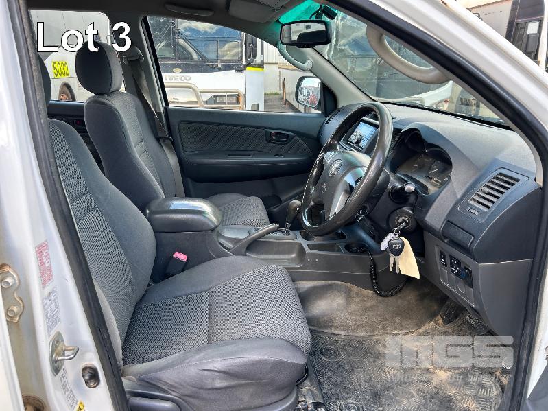 2012 TOYOTA HILUX KUN26R, 150 SERIES, DUAL CAB, TRAY TOP, 4x4 REG: S2981 CLD (SA) VIN: MR0FZ22G601179176 ENG: 1KD5700805 ODO: 112,041kms SHOWING 3.0 LITRE TURBO DIESEL, AUTOMATIC TRANSMISSION, WHITE DUCO, 4 DOORS, 5 SEAT, 4x4 ABS, AIR BAG, AIR CON, BULL BAR, CARGO BARRIER, CD PLAYER, CENTRAL LOCKING, CRUISE CONTROL, DECALS, IMMOBILISER, POWER STEERING, POWER WINDOWS, SIDE STEP, SPARE WHEEL, STEEL TRAY, TOW BAR, 2 WAY RADIO KEY #14 (WITH PAPERS, WITH 3 KEY/S, WITH OWNER'S MANUAL, WITH SERVICE BOOKS)