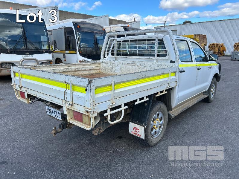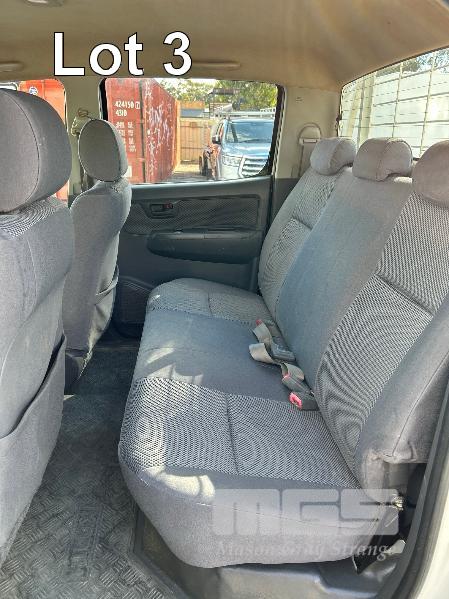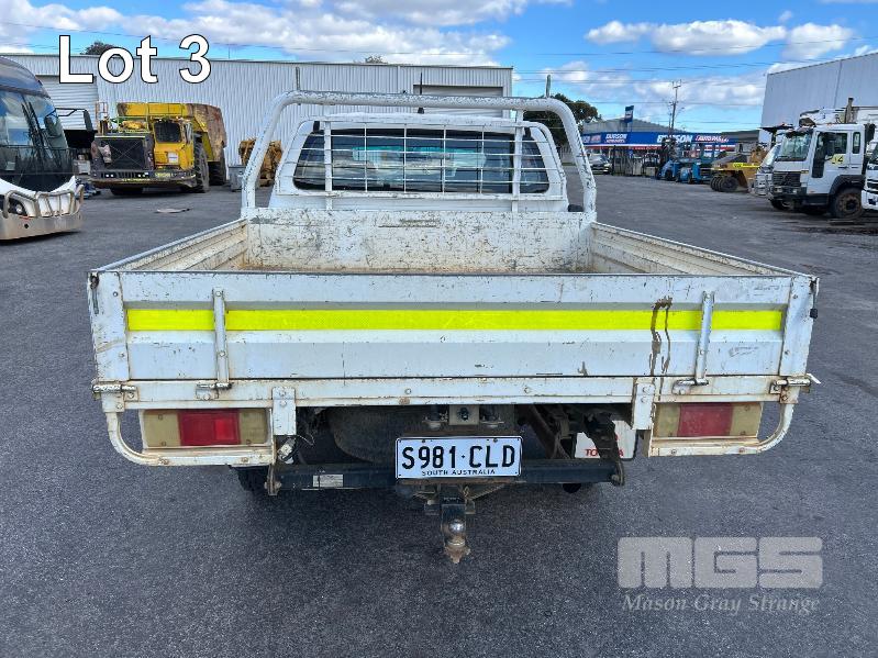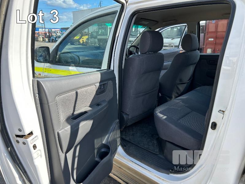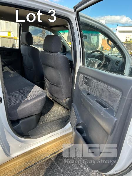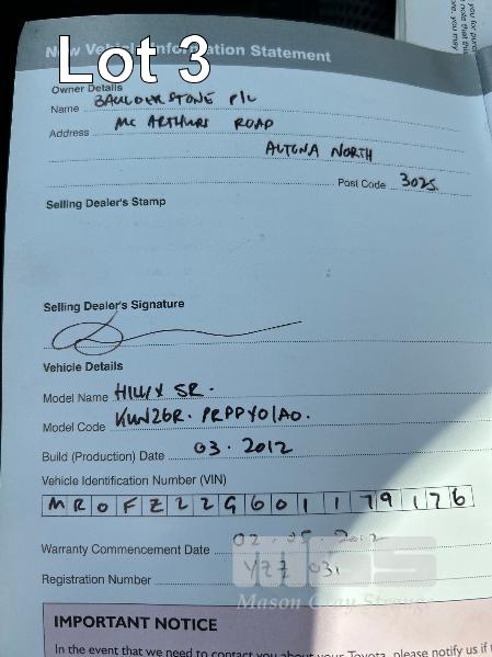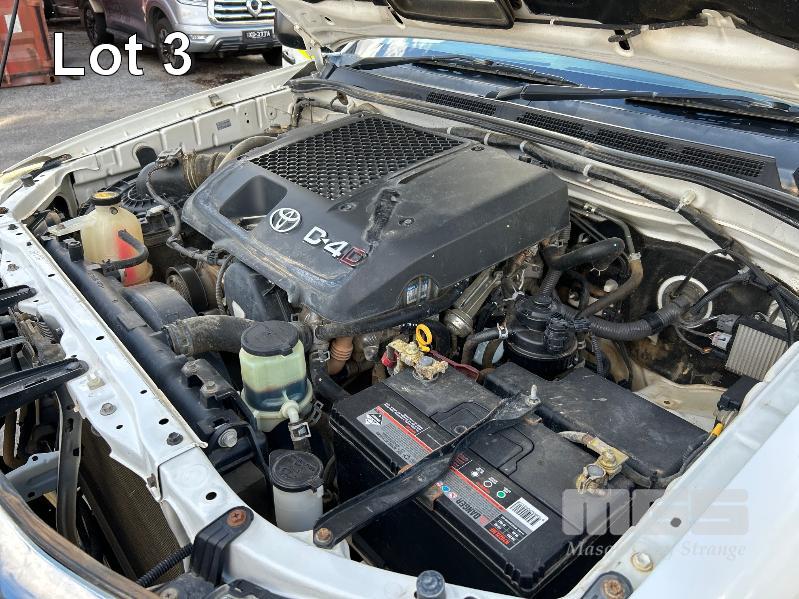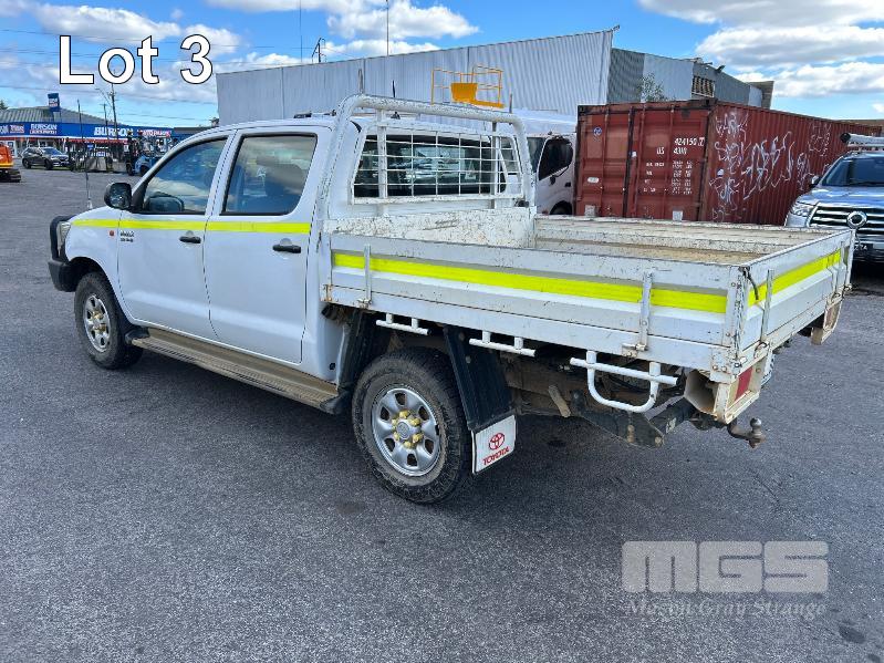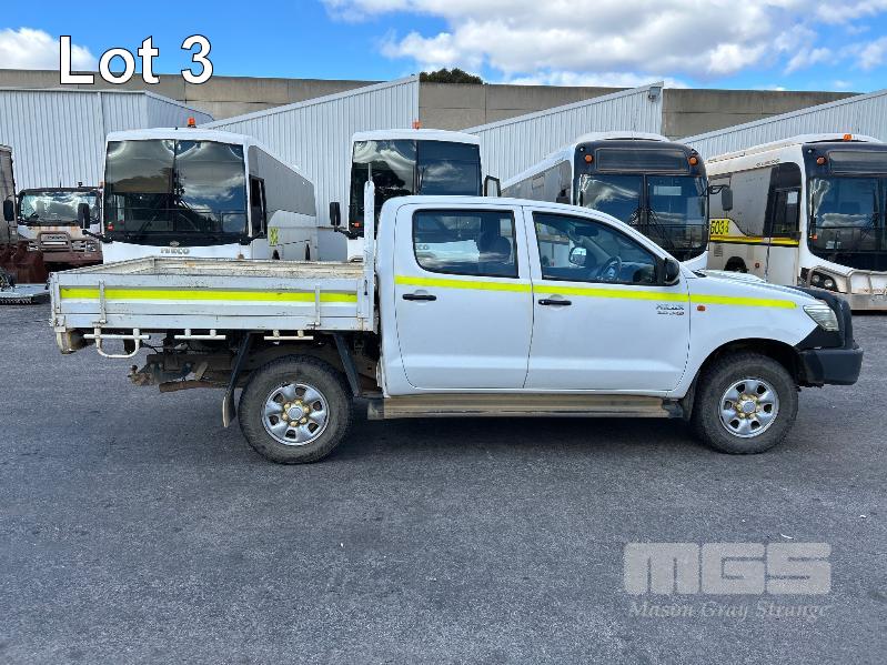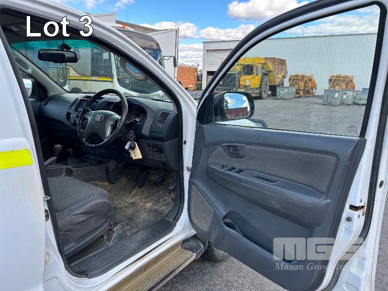 2012 TOYOTA HILUX KUN26R, 150 SERIES, DUAL CAB, TRAY TOP, 4x4 REG: S2981 CLD (SA) VIN: MR0FZ22G601179176 ENG: 1KD5700805 ODO: 112,041kms SHOWING 3.0 LITRE TURBO DIESEL, AUTOMATIC TRANSMISSION, WHITE DUCO, 4 DOORS, 5 SEAT, 4x4 ABS, AIR BAG, AIR CON, BULL BAR, CARGO BARRIER, CD PLAYER, CENTRAL LOCKING, CRUISE CONTROL, DECALS, IMMOBILISER, POWER STEERING, POWER WINDOWS, SIDE STEP, SPARE WHEEL, STEEL TRAY, TOW BAR, 2 WAY RADIO KEY #14 (WITH PAPERS, WITH 3 KEY/S, WITH OWNER'S MANUAL, WITH SERVICE BOOKS)