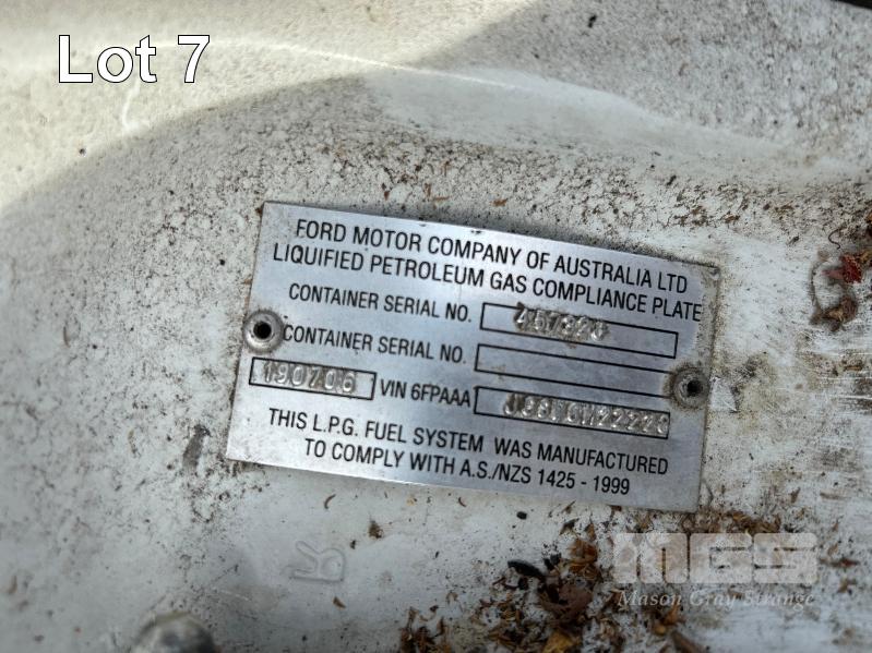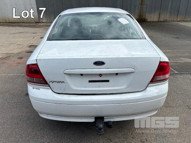 2006 FORD FUTURA BF XT SEDAN REG: NO PLATES (SA) VIN: 6FPAAAJGSW6M2228 ENG: JGSW6M2228 ODO: 204,593 kms INDICATED 4.0 LITRE, LPG, AUTO, WHITE DUCO, 4 DOORS, 5 SEAT, AIR BAG, AIR CON, CD PLAYER, CENTRAL LOCKING, CRUISE CONTROL, POWER STEERING, CONDITION UNKNOWN KEY #35 (NO PAPERS, WITH 1 KEY/S, NO OWNER'S MANUAL, NO SERVICE BOOKS)