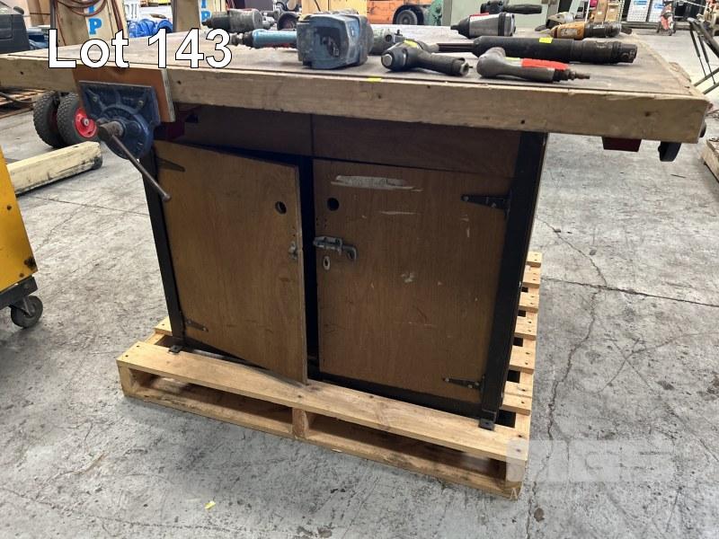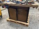 TIMBER WORK BENCH, 1250 x 1400 x 830mm (H), WITH 3 x DAWN VICES, 175mm WITH UNDER BENCH STORAGE