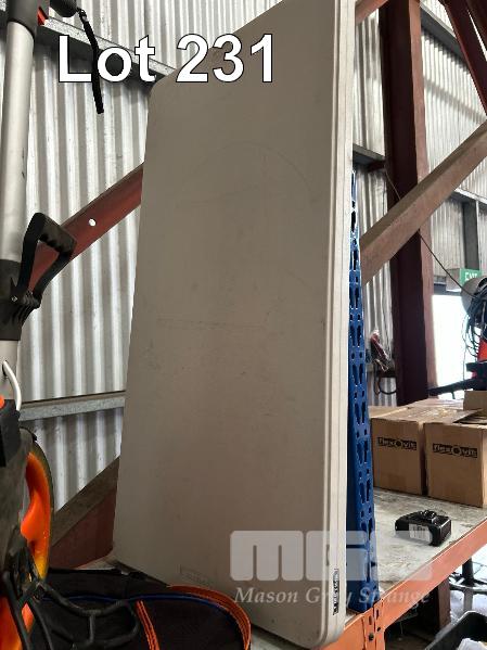 LUFKIN MEASURING WHEEL, WHITEBOARD, 600 x 900mm, 23 x BOTTLES HAND SANITIZER, 500ml, FOLDING TRESTLE TABLE, 100 x 500mm, HARDWARE, STAINLESS STEEL DOOR HANDLES, ETC 1 x SHELF