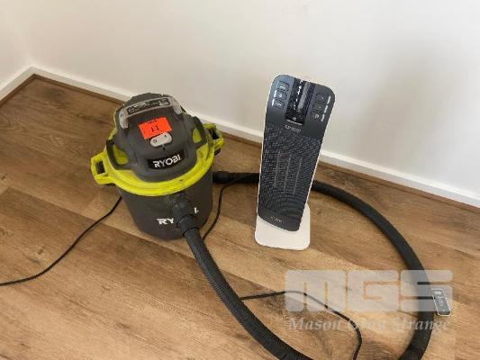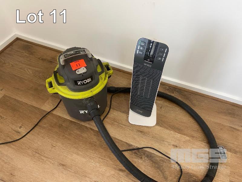 RYOBI WET/DRY VACUUM, 240V 10AMP, DELONGHI CERAMIC HEATER, 240V 10 AMP WITH REMOTE