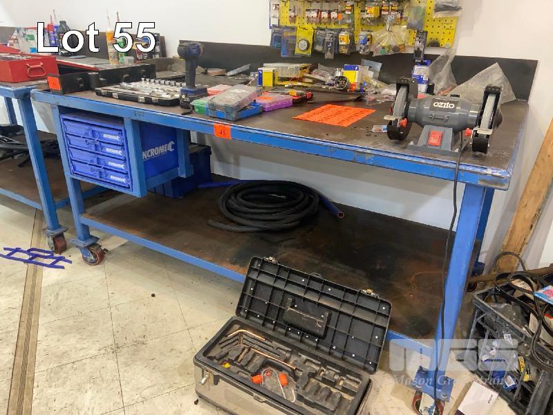 MOBILE WORKBENCH, 4mm STEEL PLATE TOP, 2 TIER, 2000 x 1000mm, UNDER BENCH PULL OUT SMALL COMPONENT STORAGE, WITH OZITO BENCH GRINDER MOUNTED, 240V 10AMP
