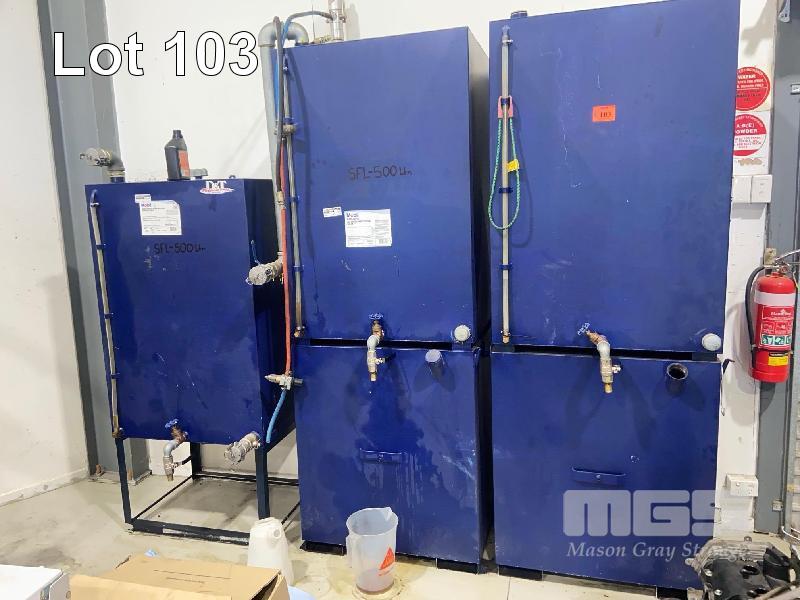 3 x BULK OIL STORAGE, APPROX 575L CAP, 2 x WASTE OIL TANKS, APPROX 500L