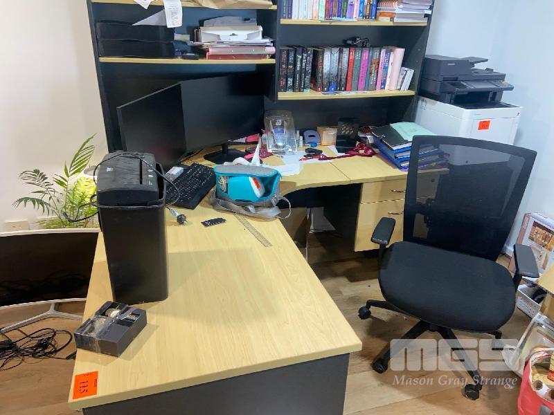 L SHAPE TIMBER DESK WITH RETURN, BOOK SHELF, PAPER SHREDDER, 2 x 22" MONITORS, SAMSUNG CURVED MONITOR, GAS LIFT CHAIR