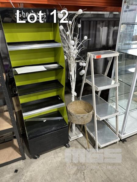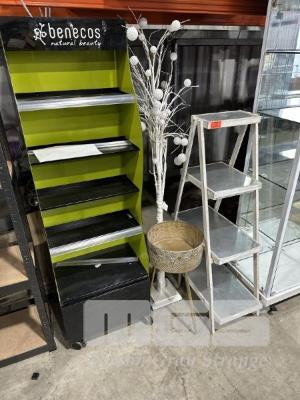DISPLAY SHELF, BLACK PLASTIC, MOBILE, ORNAMENTAL TREE, CIRCULAR TABLE & TIMBER SHELF, 4 TIER