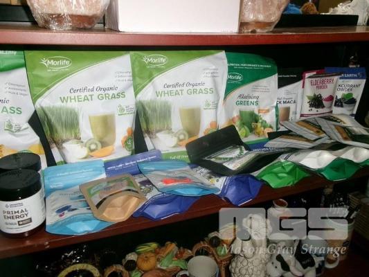 28 x ASSORTED PRODUCTS INCLUDING, ORGANIC WHEAT & BARLEY GRASS, PRIMAL ENERGY, MORINGA POWDERS, BLUE SPIRULINA, MUSHROOM EXTRACTS, ETC 1 x SHELF