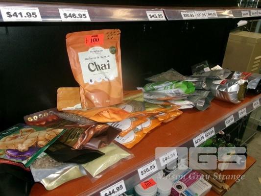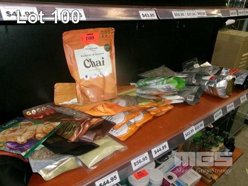 ASSORTED PRODUCTS INCLUDING ORGANIC KALE, HORSE CHESTNUT, ORGANIC MATCHA, NATIVE THYME, CELERY SEEDS, BAY LEAVES, CHAI HOT CHOCOLATE, ETC 1 x SHELF