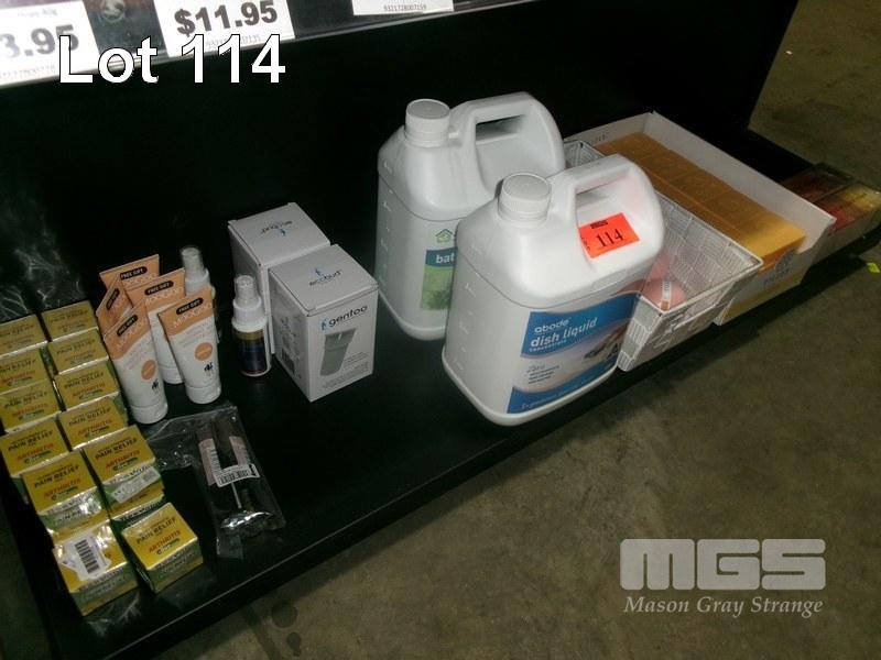 ASSORTED PRODUCTS INCLUDING PAIN RELIEF CREAMS, MOISTURISER, DISH LIQUIDS & 3 x BOXES OF SOAPS, ETC 1 x SHELF
