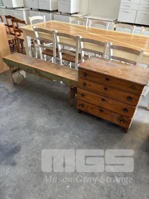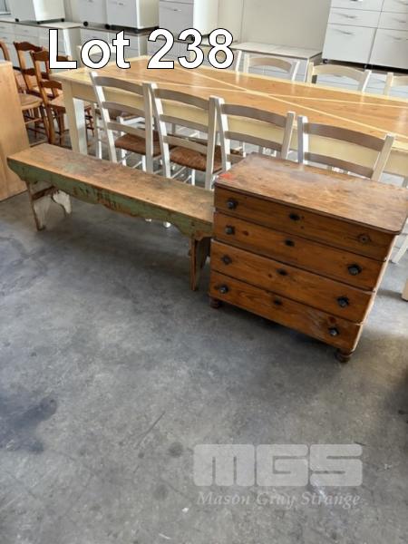 VINTAGE DRESSER, 4 DRAWER & PINE BENCH