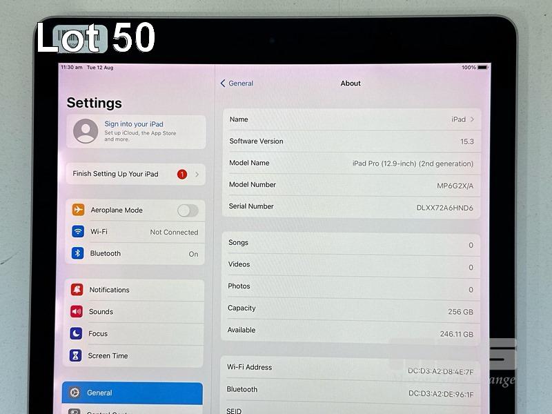 APPLE iPAD PRO 12.9 INCH, 2ND GEN, 256GB, Wi-Fi, SPACE GREY, MODEL MP6G2X/A, A1670 (NO CABLE, NO CHARGER) (NOTE: SCREEN BLEMISHES) S/N:DLXX72A6HND6