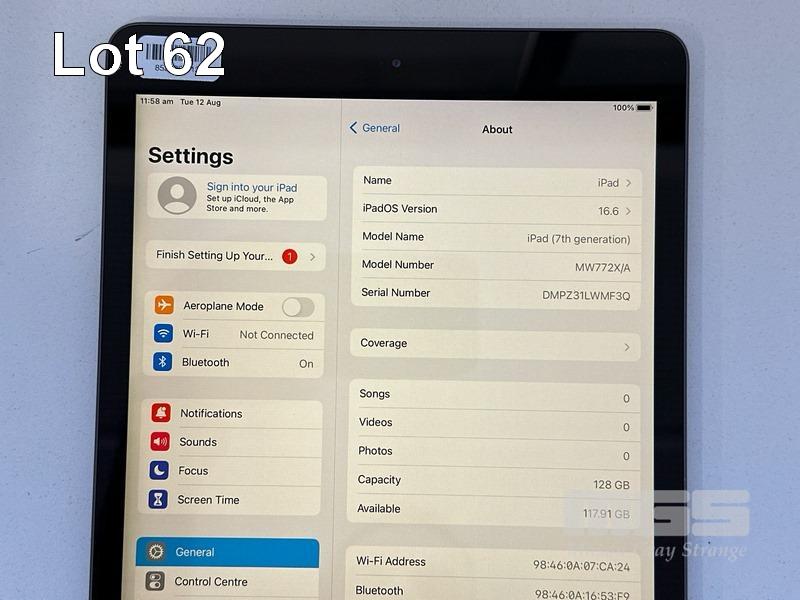 APPLE iPAD 7TH GEN, 128GB, Wi-Fi, SPACE GREY, MODEL MW772X/A, A2197 (NO CABLE, NO CHARGER) (NOTE: DENTS IN CASING) S/N:DMPZ31LWMF3Q