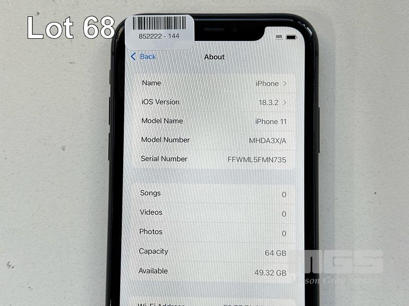APPLE iPHONE 11, 64GB, MODEL MHDA3X/A, A2221, BLACK, BATTERY HEALTH 99% (NO CABLE, NO CHARGER) (NOTE: MINOR SCRATCHES ON SCREEN) S/N:FFWML5FMN735