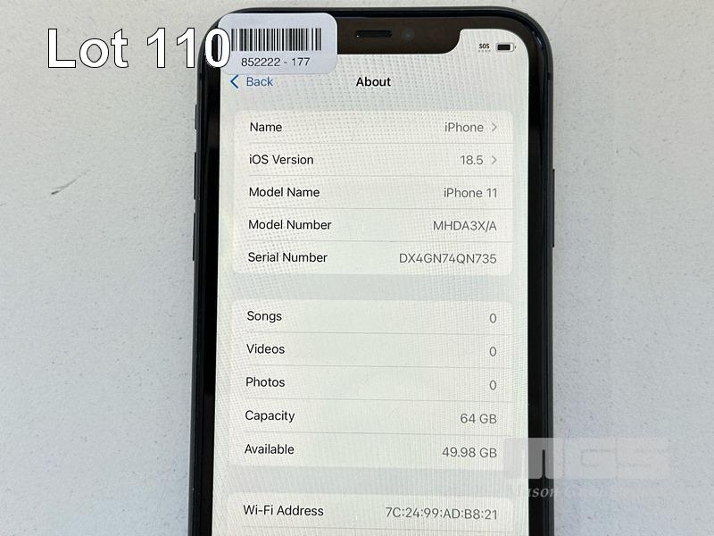 APPLE iPHONE 11, 64GB, MODEL MHDA3X/A, A2221, BLACK, BATTERY HEALTH 82% (NO CABLE, NO CHARGER) (NOTE: SCRATCHES ON SCREEN) S/N:DX4GN74QN735