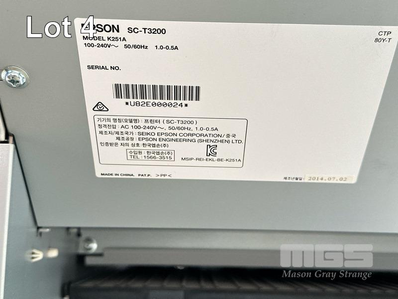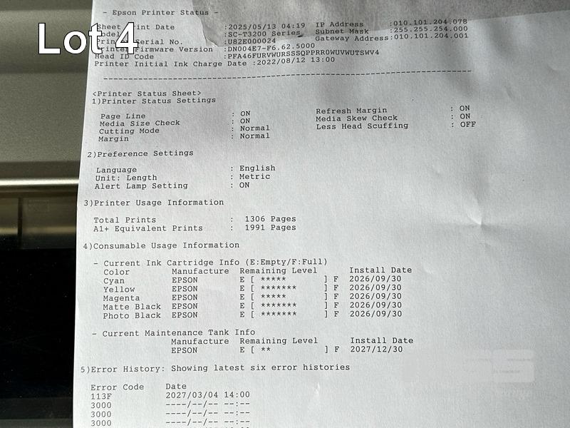 LARGE FORMAT PRINTER, EPSON SURECOLOUR T3200, 24", MODEL K251A, USB, NETWORK TOTAL PRINTS, 239m2 (TEST PAGE ATTACHED) (NOTE: MESSAGE "REPLACE MAINTENANCE BOX SOON") S/N:U82E000024