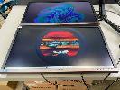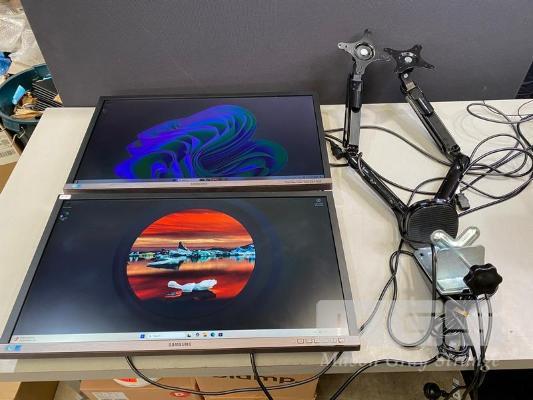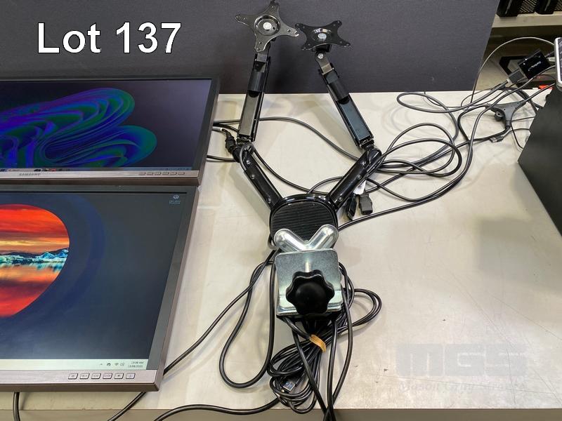 2 x MONITORS, SAMSUNG 28" 4K UHD FREESYNC LED WIDESCREEN, U28E850R, HDMI, DISPLAYPORT (WITH CABLES) WITH DUAL DESK MOUNT MONITOR ARM, BLACK S/N:0MPUHTHG500312R, 0MPUHTHG500315B