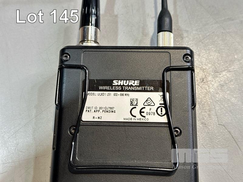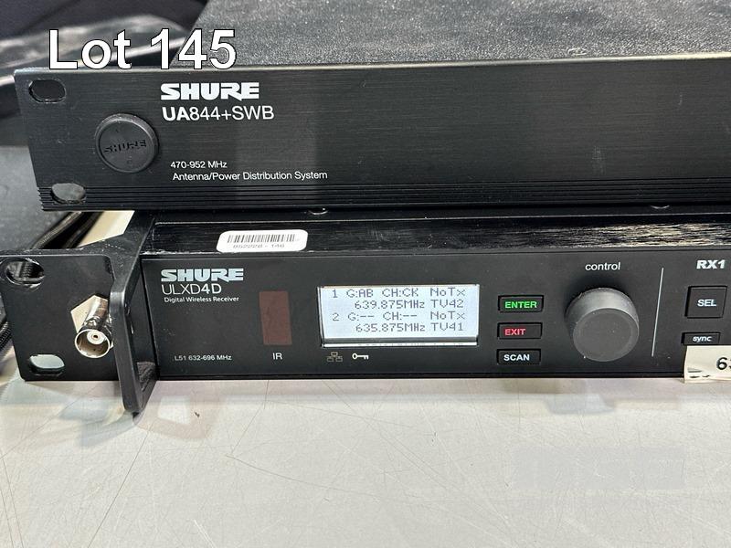 SHURE ULXD4D DUAL CHANNEL DIGITAL WIRELESS RECEIVER, L51 632-606MHz, SHURE UA844+SWB ANTENNA/POWER DISTRIBUTION SYSTEM, 470-952MHz 2 x SHURE ULXD1 BODYPACKS WITH LAPEL MICROPHONES, 1 x DUAL DESKTOP CHARGER WITH POWER SUPPLY